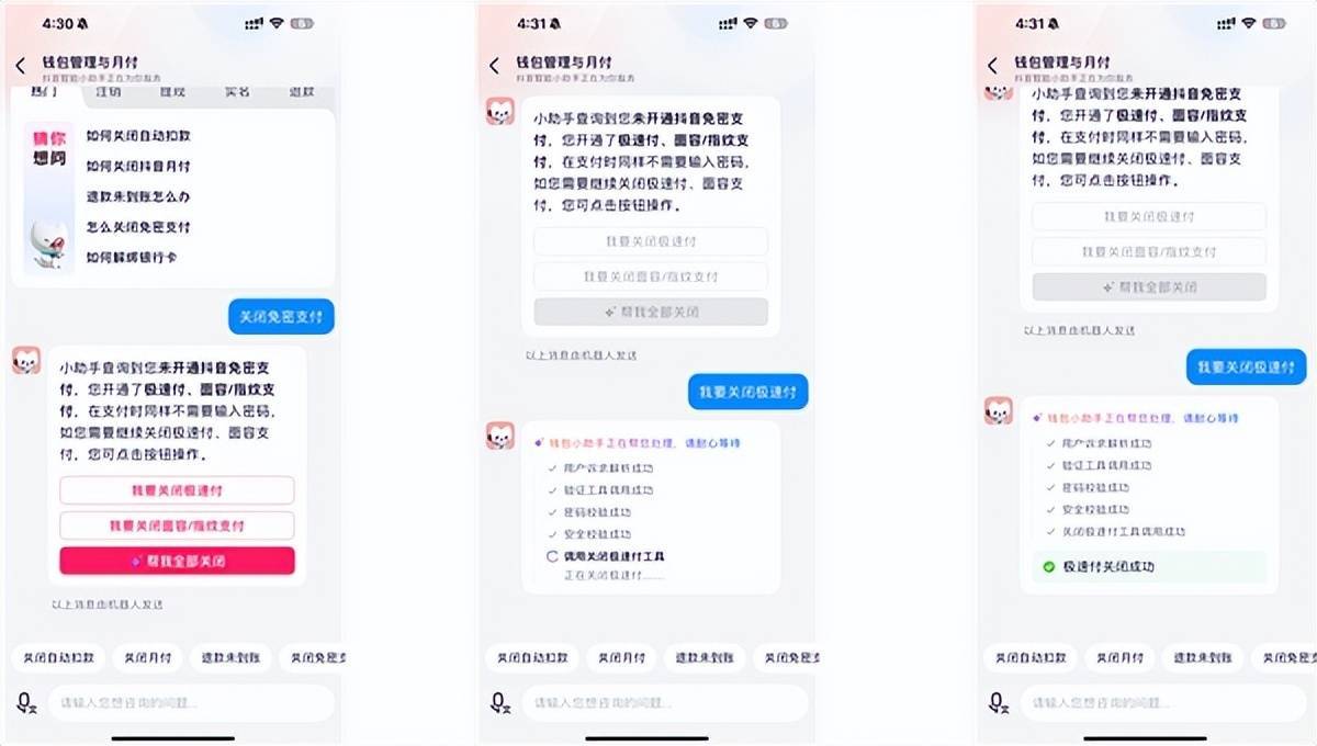 图:输入“我要关闭极速付”关键词,系统自动解决问题