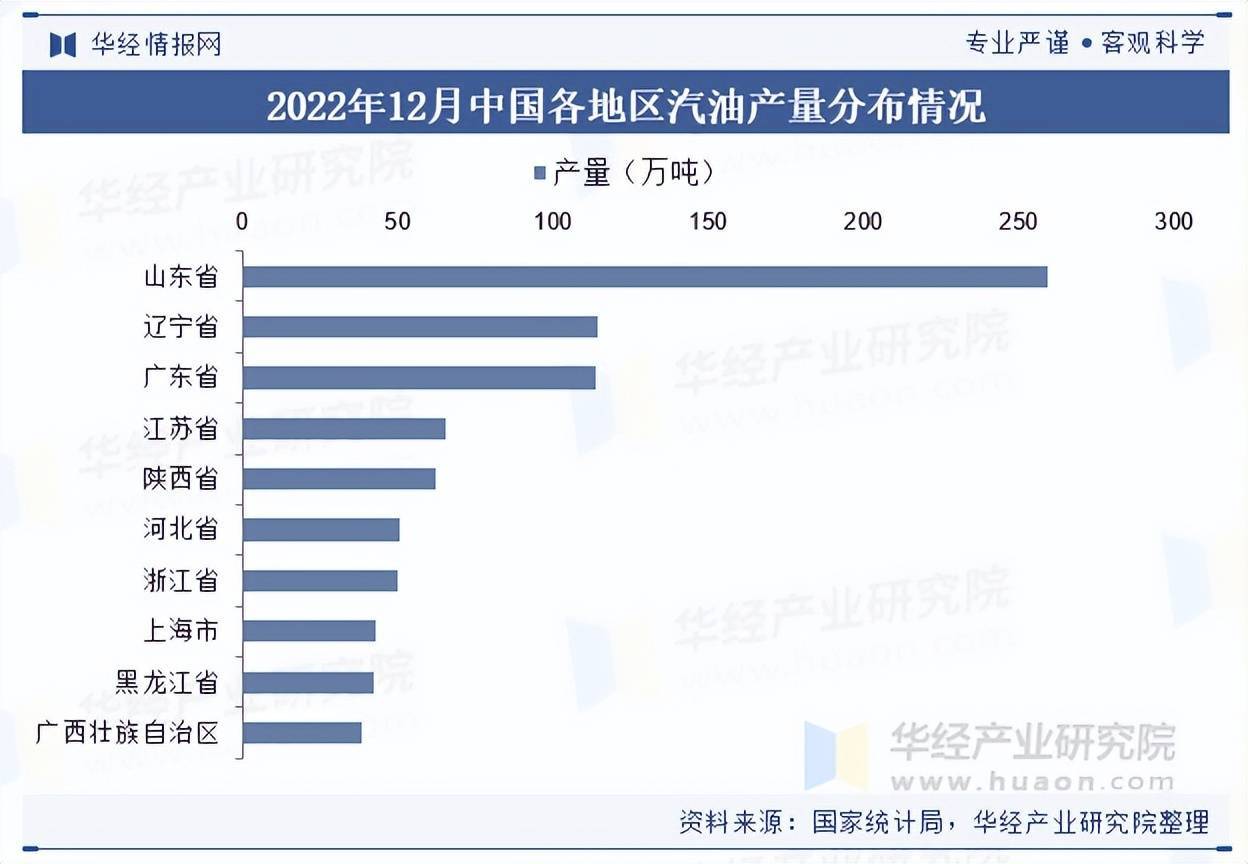 分地区来看,2022年12月全国汽油产量排名前三的地区为山东省、辽宁省和广东省;产量分别为259.7万吨、114.5万吨和113.6万吨。